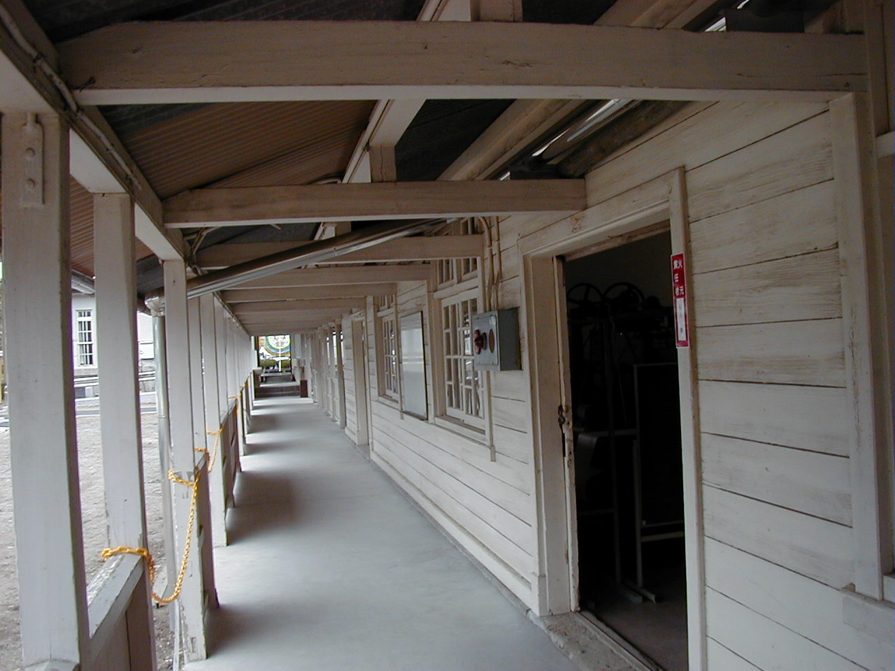 入口を入って右に事務所、左にショップがあります。その奥に長い渡り廊下が続き、かつて実験室であったと思われる作りの部屋が展示室になっています。