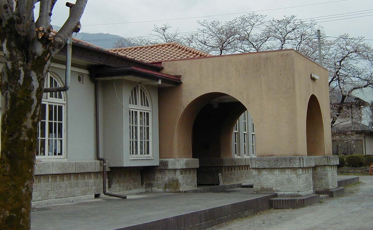 案 内: 国道140号線を南下して秩父市役所の前で右折し、羊山公園の方に1区画ほど入ったところにあります。秩父市が作った案内板には、次のように書かれています。“この施設は、昭和5年9月に秩父絹織物同業組合(現秩父織物商工組合)が秩父地域の繊維産業の向上と振興を図るため建築し、埼玉県秩父工業試験場を誘致いたしました。 昭和58年4月に埼玉県繊維工業試験場秩父支場に改組され、秩父地域繊維産業の発展のために大きな役割を果たしてきましたが、平成10年3月に県内工業試験場の再編・統合で廃止されることになりました。 本館はアメリカ人建築家ライト氏が考案した大谷石積みの外装や昭和初期の特徴的な装飾との調和が建築的に非常に優れており、三角屋根の工場棟や渡り廊下も含め、平成13年10月に国の登録有形文化財に指定されております。 このたび、ちちぶ銘仙館として、秩父織物・銘仙等の歴史上貴重な史料の展示や伝統的な技術を伝承するための施設として、昭和初期の面影を残した形で改修いたしました。 秩父銘仙の歴史を刻んだ建物をごゆっくりご覧ください。 2002年1月”。