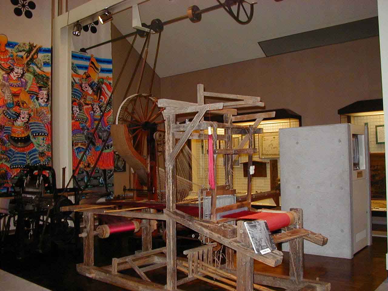 案 内:玄関左手の田中正造の銅像に象徴されるように、佐野市郷土博物館は、田中正造関係の資料と佐野市の原始から近現代への流れ(佐野の源流をたすねて)が展示された博物館です。その一角に、産業と交通の発展のコーナーがあります。佐野市域の産業を代表するものは織物業で、なかでも綿縮(めんちぢみ)は明治20年代が最盛期でした。