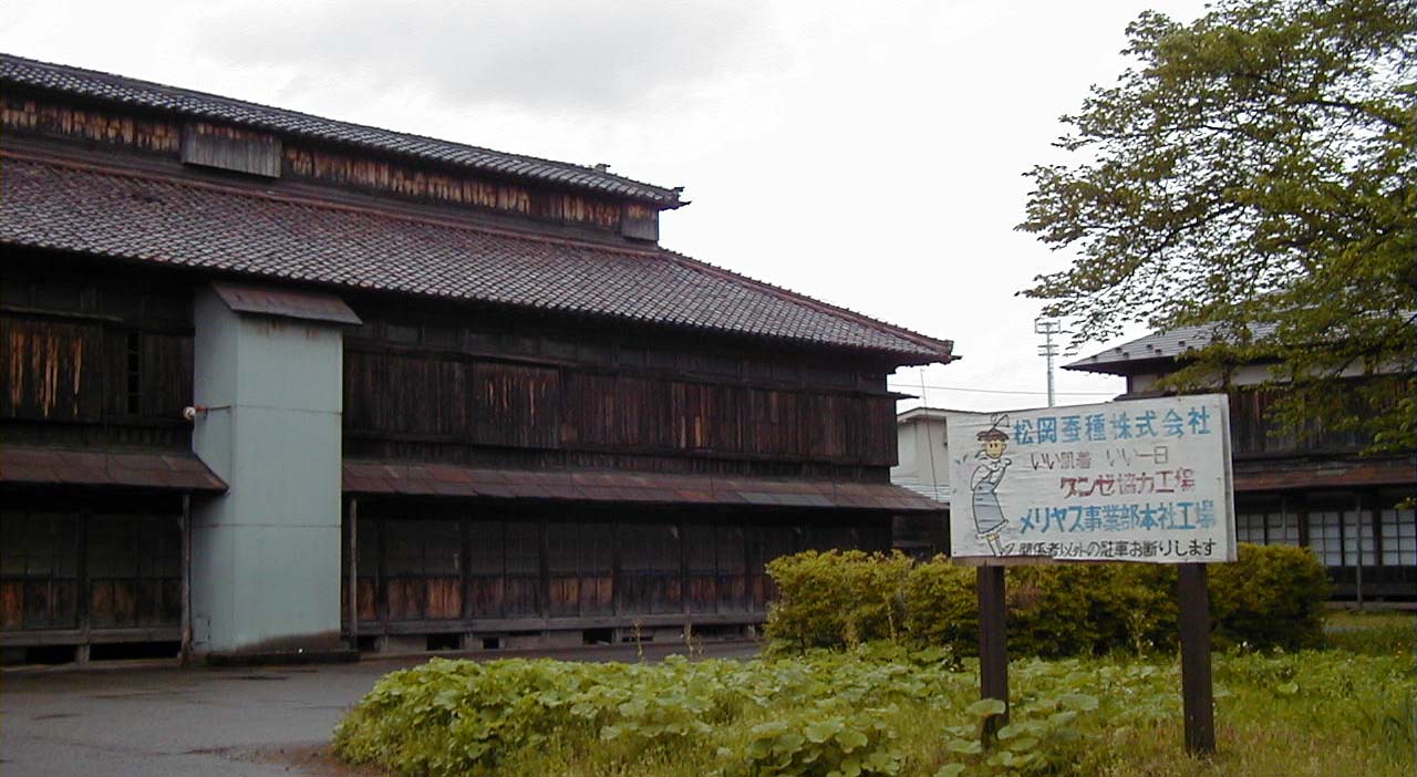 松ヶ岡では、明治7年までに311ヘクタールの桑園を造成、明治10年までに大蚕室10棟(明治8年4月に4棟、9年4棟、同年冬に2棟)を建設して養蚕事業を開始し、鶴岡に明治20年、製糸工場を、昭和10年に絹織物工場を建設しました。上の写真は、こうした先人の偉業顕彰のため、昭和58年に、1番蚕室を使って開設した松ヶ岡開墾記念館です。これらは、旧西田川郡役所や旧鶴岡警察署等の設計施工にあたった棟梁高橋兼吉の作で、上州島村の田島家の蚕室(上州島村式)を模したものといわれています。1階には養蚕や織物関係の道具類が、2階には、田中正臣、田中正佐兄弟が収集した日本全国の郷土玩具コレクションが展示されています。「松ヶ岡開墾記念館」と書かれた門柱は、旧庄内藩主酒井家第16代酒井忠良公の書の集字によるものです。