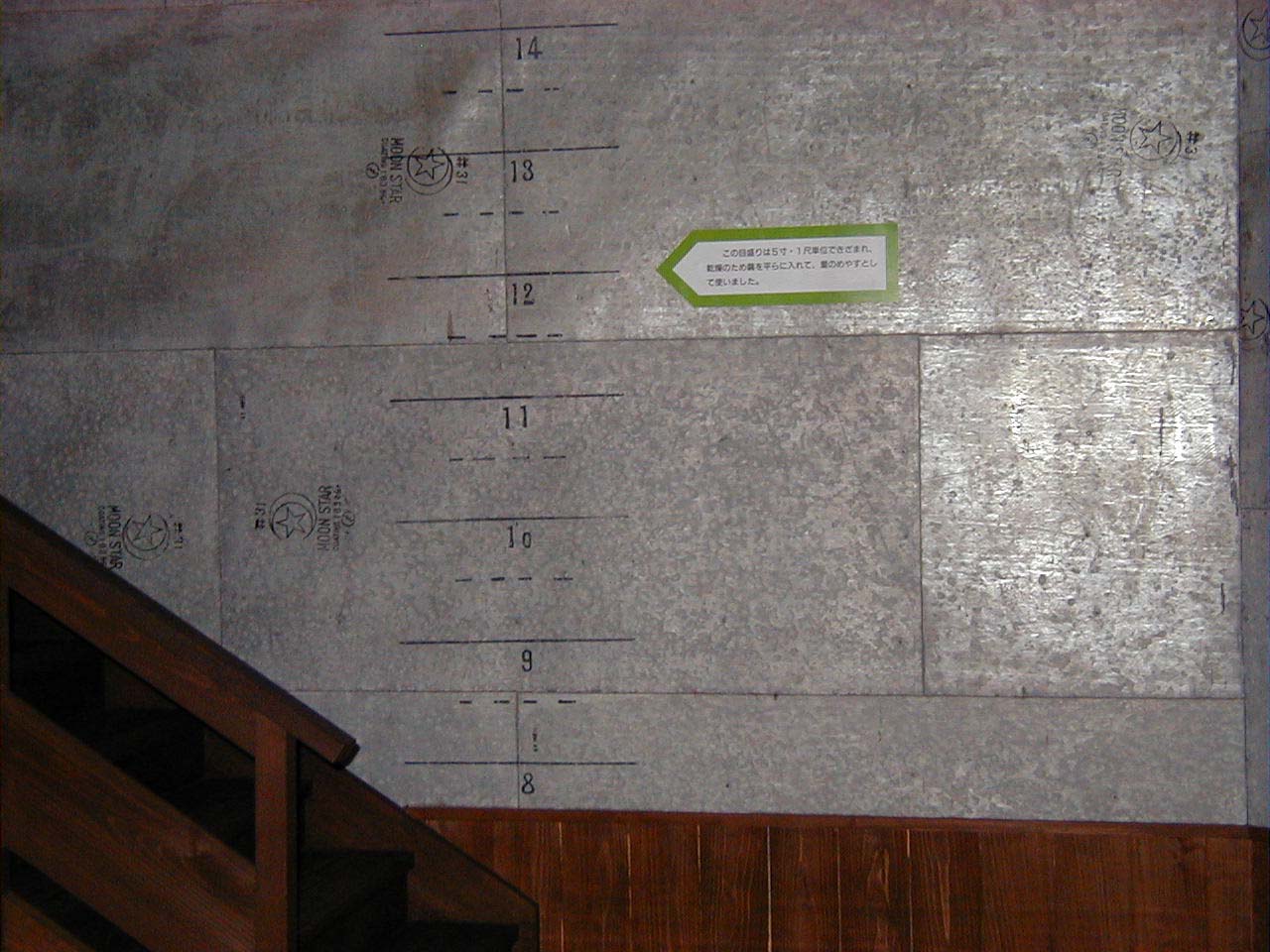 左:「語り部の館」から「資料館」へ続く通路、右:残されたトタン張りの壁の一部(実線の間は1尺)