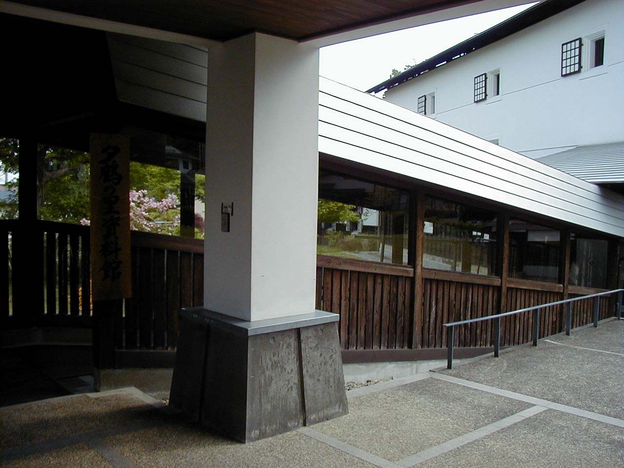 案 内: 夕鶴の里は、「語り部の館」(上写真左の建物群)と「資料館」(右側の蔵部分)とからなっています。「語り部の館」には、伝統工芸実習室、郷土料理研修室、図書コーナー、文化研究室、売店・喫茶コーナーの他に語り部ホールがあり、民話の口演が行われています。