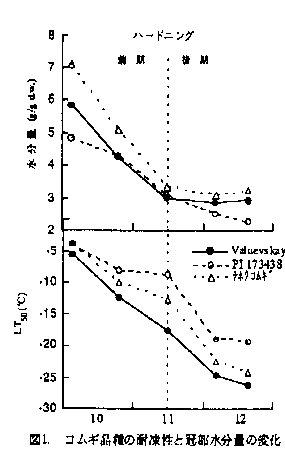 1.小麦の耐凍性はハードニング期間中ほぼ直線的に増大する。水分量は氷点下気温となる11月中旬迄は耐凍性と比例して減少するが、それ以降の水分減少はほぼ停止または微量となる。水分量の変化からハードニングステージは二分されることが認められる(図1,図2)。すなわち、耐凍性はハードニング前期では水分の減少に伴い増加するが、後期は水分量との関係は少なくなり、むしろ体内物質の影響を大きく受けることが推測される。
