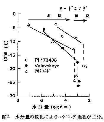 小麦のハードニングステージは体内水分量の変化パターンにより2期に分けられ、前期においては水分の減少に伴って耐凍性が増大する。後期は水分の減少はほぼ停止して、蓄積物質の影響が大きい。その時期に耐凍性型品種では単・二糖類、耐雪型品種においては主に多糖類の蓄積が増す。