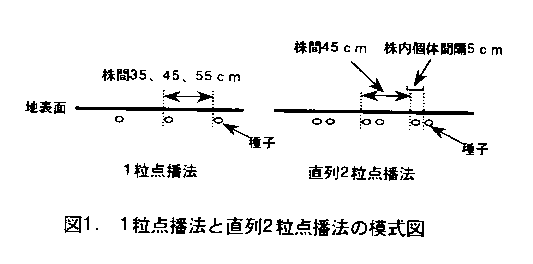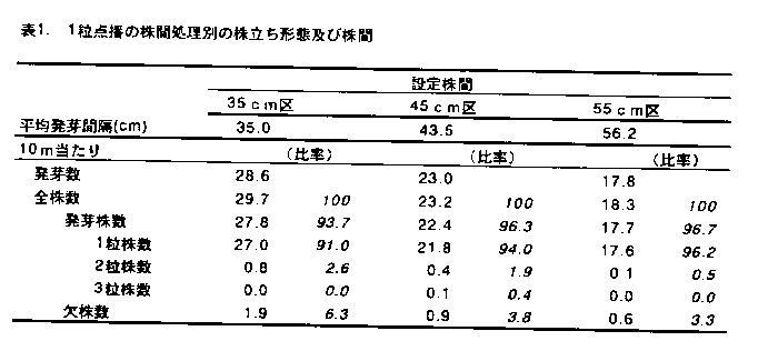 2) 1粒点播の場合、株間間隔によって発芽株立ち率が異なり、株間が35pから55pと広がるほど高い株立ち率が確保できる(表1)。この場合の株間間隔の変動係数はほぼ5%以下である。