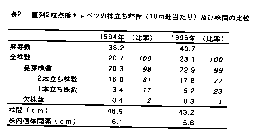 1粒点播と直列2粒点播法による直播キャベツの株立ち率
