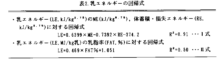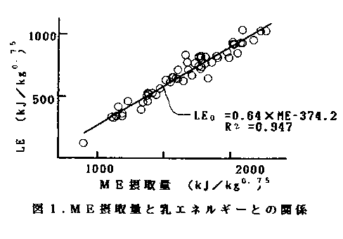 A 表1のT式から、LEのデータを体蓄積・損失エネルギー=0に補正した結果、そのLE0(kJ/ kg0.75)とME(kJ/kg0.75)との間には直線的関係が認められ(図1)、泌乳期をとおして給与される実用的な飼料構成の範囲内では、MEの乳生産への利用効率(kl)は定数として扱える。そのkl値は64.0%であり(表2)、日本飼養標準(乳牛、1994年版)のkl値62.0%と近似している。