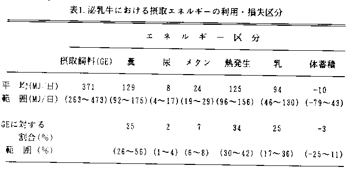@ 泌乳牛のエネルギー区分は、摂取エネルギーが371MJ/日であり、摂取エネルギーに対するエ ネルギー利用・損失区分の割合は表1のとおりである。GE(総エネルギー)、DE(可消化エネルギー)、ME各摂取量の乳エネルギー(LE)への利用効率はそれぞれ25%、39%、45%となり、'61〜62年のエネルギー代謝試験成績で示された利用効率にくらべ、50%前後(47〜56%)改善 されている。