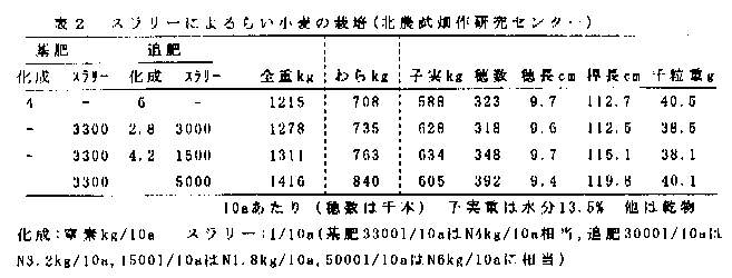 2.道東地域の斜網地区や小麦が栽培できない根釧地区で,700kg/10a(乾物)以上のわらの生産量が期待できる(表1)。なお,子実の利用法は検討中である。 3.スラリーで化学肥料相当量のアンモニア態窒素を施用することで,らい小麦の収量 は化成肥料と同等以上となり栽培が可能である(表2)。