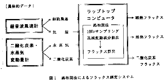 1.本システムは、超音波風速計と赤外線吸収型の水蒸気・二酸化炭素変動量計による乱流変動の計測データをパーソナルコンピュータに入力して乱流変動成分を抽出し、渦相関法により顕熱・潜熱・二酸化炭素フラックスを算出する、可搬型の計測システムである(図1)。