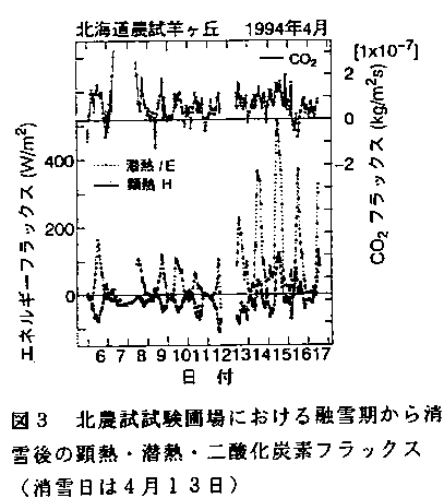 3.本システムを用いて行った熱帯赤道域と冬季積雪面上の観測では、良好なデータが得られている。熱帯の草地上の事例では、顕熱・潜熱のフラックスが全天日射量の変動に素早く対応するなどの結果が得られている(図2)。また、札幌における融雪期の10日以上の長期連続観測では、消雪の前後で顕熱・潜熱フラックスの日変化パターンが全く異なるなどの新しい知見が得られている(図3)。