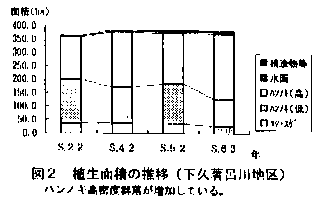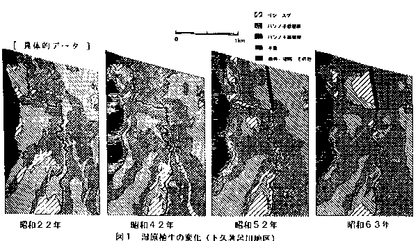 1.昭和22年から昭和63年までの航空写真を目視判読して湿原植生を分類し、ベクトルデータとしてGISに取り込み、植生分布の変動と各植生の面積変化を求めた(図1、図2)。これによりハンノキ高密度群落が増加傾向にあることが明らかとなった。