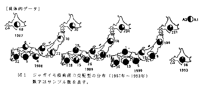 1.北海道におけるA2型菌の割合は調査開始の1987年から次第に増加し、1991年以降A1型菌は大半の地方でほとんど認められくなり、A2型と交替した。ただし、道南地方でのみ1991年以降もA1型菌が認められている。西南日本では調査開始の1988年、東日本でも1989年以降、A1型菌がほとんど認められなくなり、A2型と交替した。(図1)。