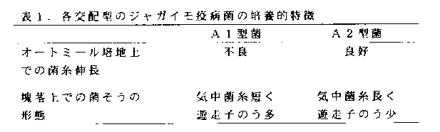 2.A2型菌はA1型菌と比較して培養的性質が大きく異なっていた。A1型菌は、オートミール培地上の菌糸生育が不良で、ジャガイモ塊茎スライス上では気中菌糸が短く遊走子のう形成量が多い菌そうを形成した。一方、A2型菌は、オートミール培地上の菌糸生育が良好で、塊茎スライス上では気中菌糸が長く遊走子のう形成量が少ない綿毛状の菌そうを形成した(表1)。