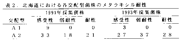 3.A1型菌の多くはメタラキシル感受性菌で、弱耐性菌は少数であった。一方、A2型菌は1989年に耐性菌や弱耐性菌の存在が確認されたのち、それらの割合が次第に増加し、北海道では1993年には弱耐性菌、耐性菌の割合が約70%になった(表2)。