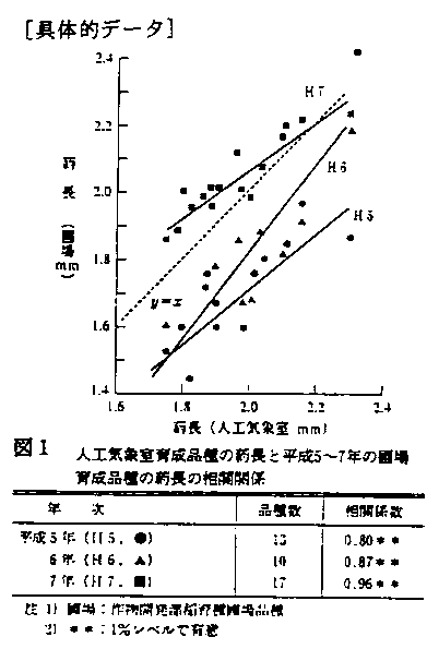 2)人工気象室(25/19℃)で健全に育成した品種の葯長と圃場で育成した平成5〜7年の各年の品種の葯長との間には、いずれの年も高い正の相関関係がある(図1)。