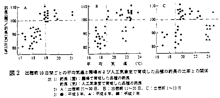 生殖生長期間の生育温度に依存して形成される葯当たり花粉数は受精時における不稔と密接な関係がある。ところが、平成5年から7年の3ヶ年は気象変動の大きい年であり、花粉形成を簡便に推定するための葯長の評価に好適な年次である。