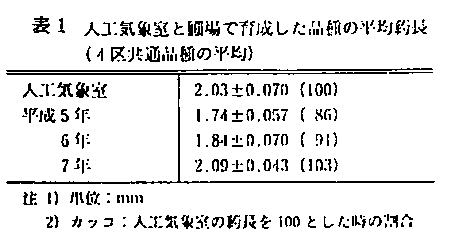 3)人工気象室で育成した品種の平均葯長を100(対象区)とした時、大冷害であった平成5年の圃場の平均葯長は86と短く、また平年に比べ高温に推移した平成6年の平均葯長も91と短い。一方、平成7年は気温変動が大きいにもかかわらず人工気象室で育成した品種の平均葯長とほぼ同じ大きさである(表1)。