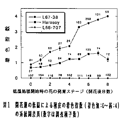 4)着色と裂皮に関する低温感受性は花の生育ステージが進むにつれて増大し、両者の系統間差異は同じ傾向を示す。種子の着色指数(着色無:0〜甚:4)と裂皮指数(裂皮無:0〜甚:4)の間には有意な相関が認められる。そのため、両者には同一の生化学的メカニズムが関与していると推定される。