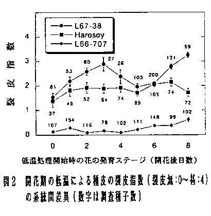 3)開花期の低温処理(同上)により、Harosoyの種皮は裂皮するが、褐毛系統(L66-707)の種皮はわずかしか裂皮せず、褐目系統(L67-38)の種皮は甚だしく裂皮する(図2)。