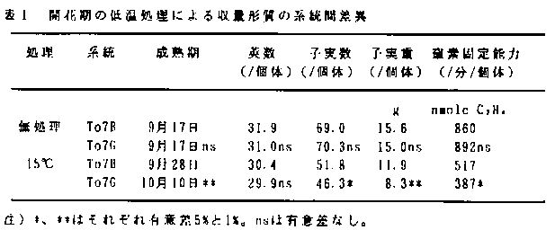 1)開花期の低温処理(開花始より15℃で4週間)の結果、白毛系統(To7G;遺伝子t、i-i)は褐毛系統(To7B;遺伝子T、i-i)に比べて、成熟期が遅延し、収量と窒素固定能力が低い(表1)。