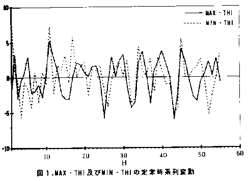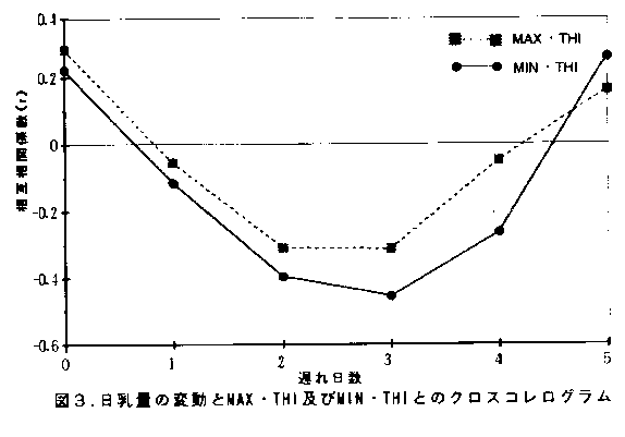 @ 最高気温THI(MAX・THI)と最低気温THI(MIN・THI)それぞれと乳量変動とのクロスコレログラムを求めた(図3)。ここでは、乳量水準による差は認められなかったので、全牛の成績をプールして以下の結果を得た。THIと乳量変化の相互相関係数は2〜3日後が負の最大値となり、その値は、MIN・THIがMAX・THIより大きな値であった。