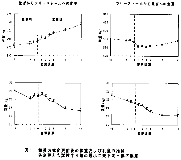 Aフリーストールから繋ぎ飼いへの変更については、変更前後の推移の傾向が、乳量では有意に異ならなかったが、体重は変更直後から有意に減少し、変更後11週目に変更前の水準に回復した。
