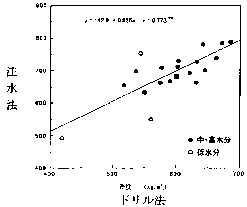 3)試作した装置で北海道における農家の大規模バンカーサイロ22基(十勝9,石狩5,天北8,)のサイレージをサンプリングして注水法による密度の測定結果と比較したところ、ドリル法では注水法の測定値よりも15%程度低い値を示すものの、1次式で回帰できることが明らかになり、(図1)本装置による簡易な密度測定が可能である。