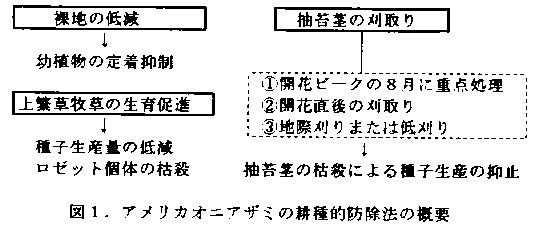 D以上の結果から、草地内に侵入したアメリカオニアザミはロゼットで2〜3年生存するものもあるが、開花個体は枯死する。従って、これを防除するには、裸地の低減及び上繁牧草の生育促進を図ってロゼット個体を抑制するとともに、8月の開花直後に抽苔茎を地際刈りまたは低刈りして種子生産を抑制すると良い(図1)。