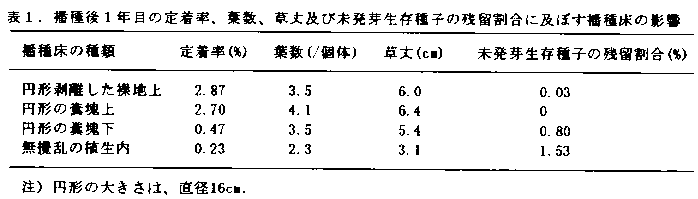 A異なる地表条件に播種した種子の定着及び幼植物の生育は、裸地や糞塊上で良好であり、植生内では不良であった。また、播種1年後の未発芽生存種子の残留割合は、いずれの播種床でも低く、埋土種子が形成される可能性は小さかった(表1)。