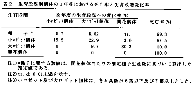B生産された種子が翌年にロゼット個体になる確率は1%未満であり、種子の死亡率は99.3%と推定された。また、小ロゼット個体は翌年においても42.4%がロゼット個体としてとどまり、その死亡率は54.5%であった。一方、大ロゼット個体の80.3%は翌年に開花し、開花個体は総て枯死した(表2)。