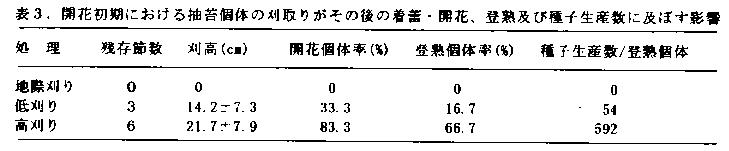 C開花初期に抽苔茎を高刈りすると、その後再生し、再生個体は開花・登熟した。これに対して、地際での刈取りあるいは低刈り(地上部残存節数=3)を行うと開花・登熟にいたる個体が激減し、種子の生産を抑制できた(表3)。