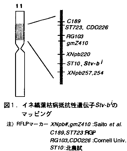1.イネ縞葉枯病抵抗性遺伝子(Stv-bi)はイネ第11染色体上腕部に座乗し、分子マーカーXNpb220とXNpb257(共にSaito、et al.)の間に座乗し、ST10(北農試開発)と密接に連鎖 する(0.0cM、図1)。
