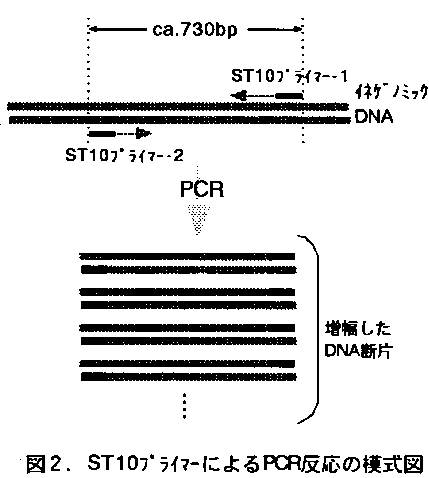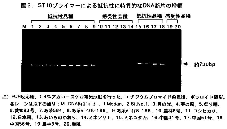 2.ST10の塩基配列から設定した、それぞれ20塩基の長さの2種1組のST10プライマーを用い、イネのゲノムDNA(CTAB法により抽出)を鋳型にPCR反応(94℃4分、94℃1分→60℃1分→72℃2分を35サイクル、72℃7分)を行うと、抵抗性品種・系統に特異的な約730bpのDNA断片が増幅する(図2〜図3)。