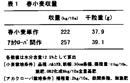 2.アカクローバ間作による小麦の収量は小麦を単作した場合の収量とほぼ同等であった(表1)。
