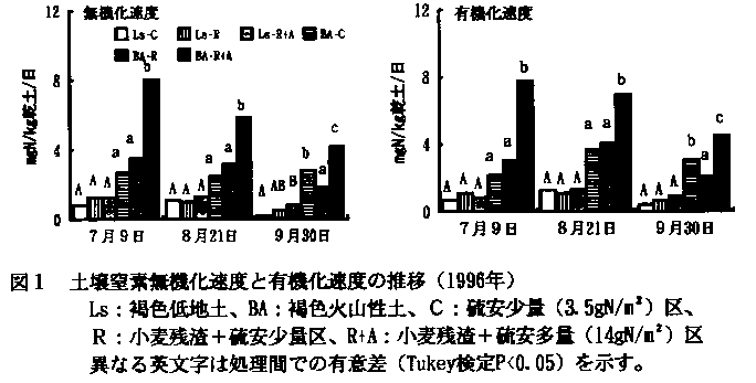 2.重窒素同位体希釈法により測定される土壌中の窒素無機化速度と有機化速度は小麦収穫物残渣をすき込んでも大きく変化しない。従って、小麦収穫跡地の”窒素飢餓”は、土壌中での窒素無機化速度の低下によるものでないと推測される。硫酸アンモニアの施用量が増加すれば、褐色火山性土では両速度とも高く維持され、褐色低地土でも無機化速度の増大が認められる。(図1)