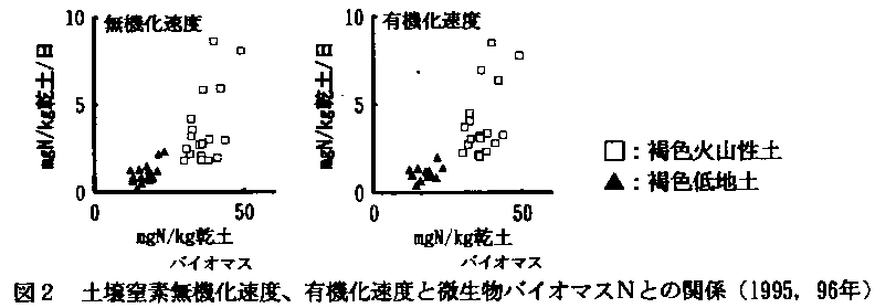 3.いずれの土壌においても窒素無機化速度と有機化速度の大小は、微生物バイオマス窒素の大小と対応し、この関係は処理による速度変化の大きい褐色火山性土で明らかであった。また、この関係は、窒素代謝速度の土壌型間の比較にも有効である。(図2)