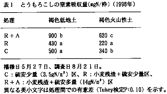 1.とうもろこしの初期生育における窒素吸収量は、硫酸アンモニアを少量しか施用しない場合には、小麦収穫物残渣をすき込むことにより低下し、特に褐色火山性土で著しかった。(表1)
