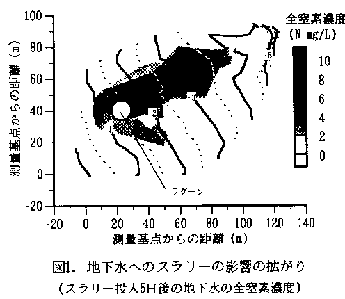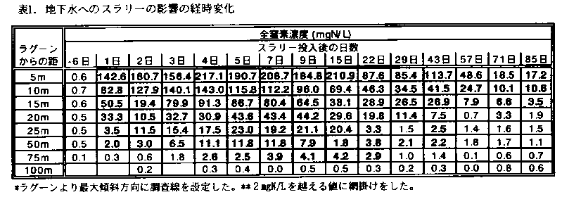 地下に難透水層とその直上に透水性の高い滞水層を持つ緩傾斜面に掘削した素掘りラグーンに、粘度の低い低濃度のスラリーを投入すると、投入直後から急速に周辺の浅層地下水を汚染し、その影響は約3ヶ月後でも認められる。