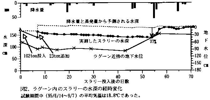3.ラグーン内のスラリーの水深は、スラリー投入直後に著しく低下し、投入10日後以降は緩慢になるが、54日後まで低下し続ける(図2)。54日後のスラリーの水深は、投入した全スラリーの水深相当値に、降水による増加を加算し、蒸発による減少を減算した計算値の77%となり、残り23%相当分のスラリーは漏出したと推定される。