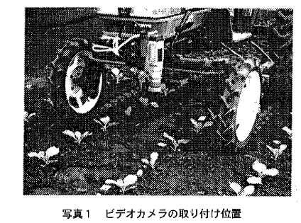 1. 画像処理システムは、ビデオカメラ、フレームメモリ、ノート型パソコンで構成し、入力画像の解像度は512×512ピクセルで濃度はRGB各256階調である。ビデオカメラはキャベツ畦の直上約80cmの高さでトラクタに装着する