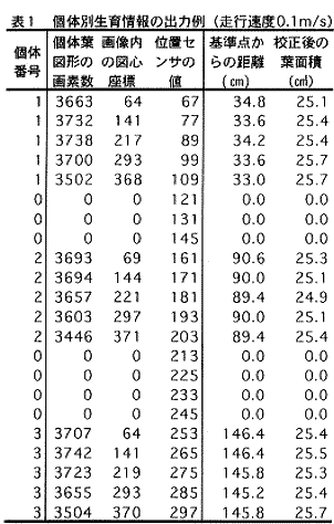 図2に示した制御を繰り返すために、個体毎に複数回の測定を行なうことになる。しかし、出力ファイルに記録された投影葉面積(画素数)、画像内重心位置及びトラクタの圃場相対位置データを、基準面積板の校正値、圃場状態に合わせた位置センサの校正値を用いて解析することにより、同一個体の圃場内相対位置は各測定ともほぼ同じで個体別生育情報を推定できる。(表1)。[成果の活用面・留意点]