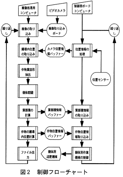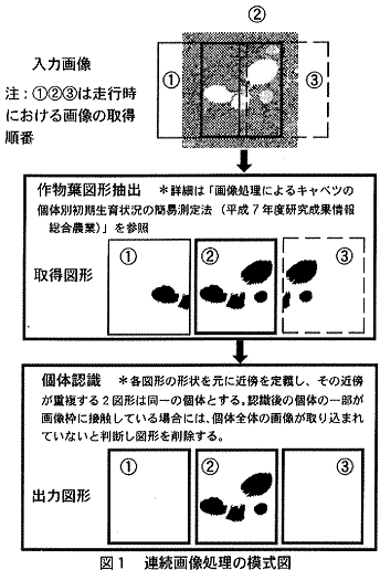 (図1)。なお、個体別投影葉面積は、作物として認識する最小面積を圃場状態に応じてあらかじめ設定することにより、小雑草が混在する状態でも計測できる。3. 作物個体の圃場相対位置は、トラクタの後車軸に設置したセンサにより一定の進行距離毎に生じさせる2相パルスの計数値、カメラ入力画像内での作物図形の重心位置(画面内における畦方向の座標)から算出する。舗装面での走行時における位置情報の分解能は約6mmである。