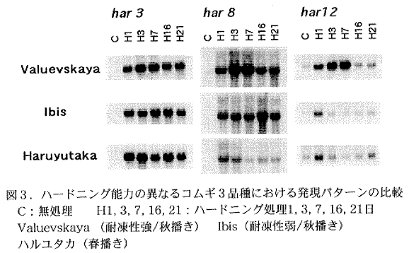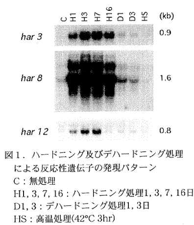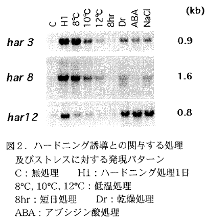 2. har3とhar8では、処理1日目から耐凍性がほぼ最高値に達する16日目までを通じて高い発現量が持続する。また、デハードニング処理1日でその発現は急減する。一方、har12では、処理7日目までは、発現量が徐々に増大するが、16日目には微量レベルまで低下する(図1)。また、ハードニング誘導と関連がある乾燥・アブシジン酸及び塩ストレスの処理によって、各cDNAクローンの発現が誘導されるが、高温処理では、発現が認められない(図2)。