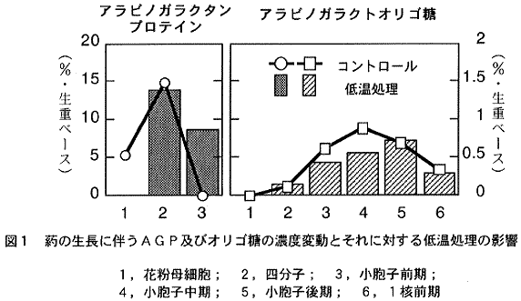 1. 低温に極めて弱い生育時期の雄しべには、アラビノガラクタンプロテイン(AGP)とアラビノガラクトオリゴ糖という糖質が、前後して高濃度に蓄積することを初めて発見した。