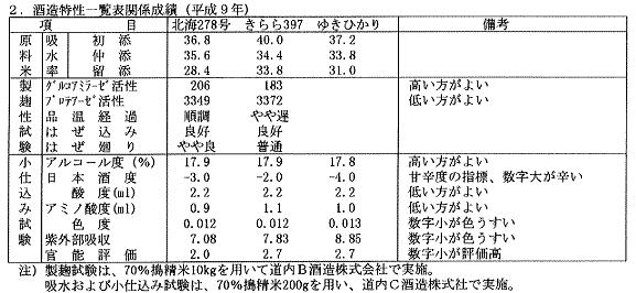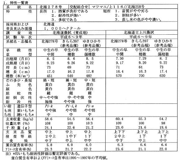 1. 水稲「北海278号」は、マツマエ/上116//北海258号の交配組み合わせから選抜された酒造用粳系統である。
