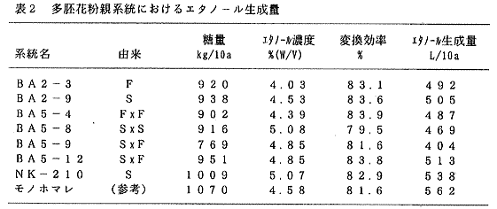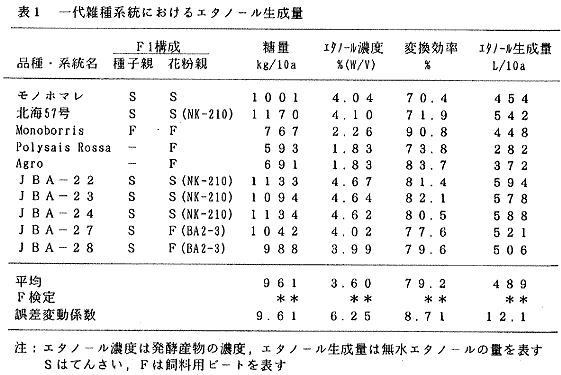 . 育成一代雑種系統では,「JBA-22」,「JBA-23」及び「JBA-24」の3系統がエタノ−ル生成量及びエタノ−ル濃度が高く有望である(表1)。2