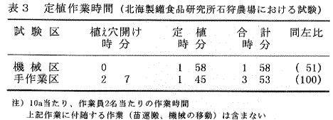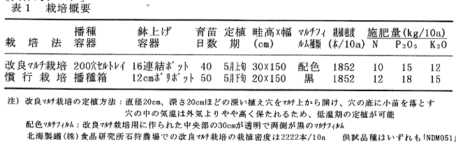 北海道の加工用トマトの栽培は、露地マルチ栽培が主流であるが、規模拡大を図るために、府県で開発された改良マルチ栽培法(表1参照)について、その省力性と本道における適応性を明らかにする。