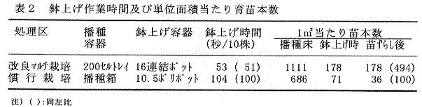- 改良マルチ栽培では育苗期間が10日短縮される上、育苗スペースの節約及びセル成型苗を鉢上げ苗として用いることによる育苗作業の省力化が可能である。