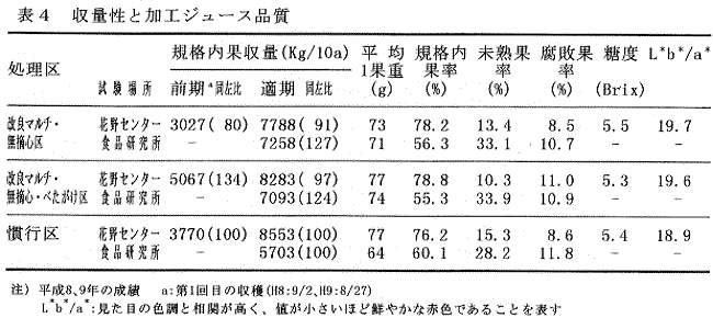- 慣行栽培と比較するとジュース品質の差は小さく、ほぼ同等である。